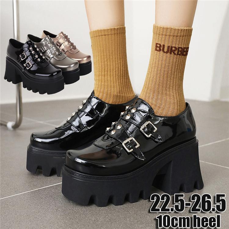 楽天市場 ショートブーツ ブーティ 厚底靴 レディースファション エナメル調 レディースシューズ 女 太ヒール 欧米風 鎖付き リベット付き サイドジッパー ストラップタイプ 痛くない 歩きやすい 秋冬 黒 スイートカジュアル